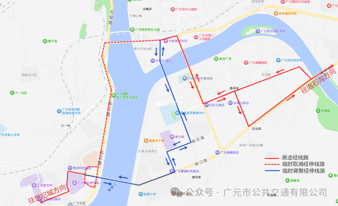 調(diào)整后經(jīng)停站點:途經(jīng)供排水公司、南河汽車站(西)、南河體育場、玉樹家園、皇都首座至國際商貿(mào)城: